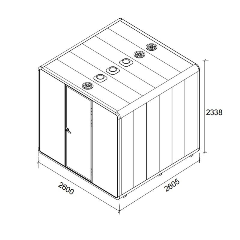 | Внешний размер: | W2600*D2605*H2338mm | Материалы: | Сталь, алюминий, акустические платы из волокна, ламинированное стекло |