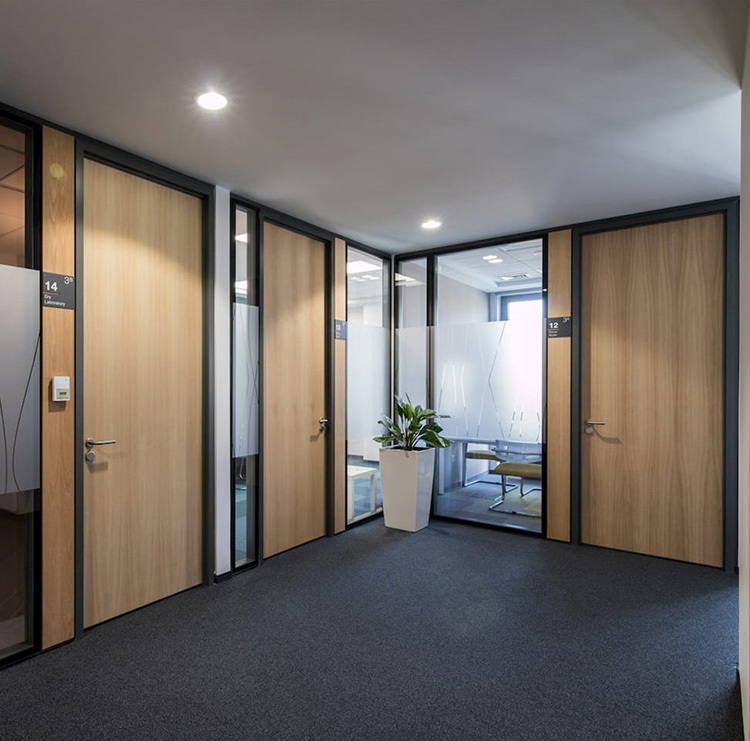 1) Гибкость дизайна поверхности: Перегородки предлагают широкий спектр дизайнов. Выбирайте прозрачное, матовое, рифленое, PDLC или тонированное стекло для прозрачности или конфиденциальности. Варианты с глухими панелями из меламина или стали в широком ассортименте цветов и текстур.