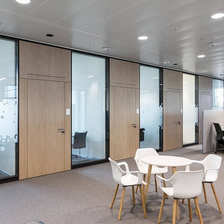 1) Гибкость дизайна поверхности: Перегородки предлагают широкий спектр дизайнов. Выбирайте прозрачное, матовое, рифленое, PDLC или тонированное стекло для прозрачности или конфиденциальности. Варианты с глухими панелями из меламина или стали в широком ассортименте цветов и текстур.